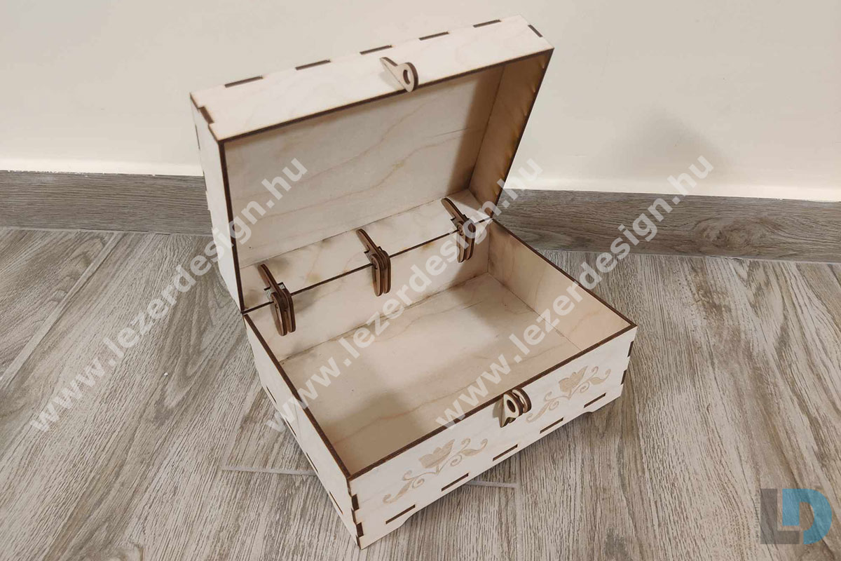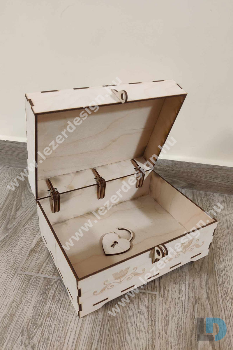 A doboz alsó része díszítő motívumokkal van ellátva, amelyek tovább növelik a termék esztétikai értékét. A szív alakú zár egy különleges, figyelemfelkeltő részlet, amely nemcsak praktikus, de romantikus hangulatot is áraszt. A doboz belsejébe kisebb ajándékokat, leveleket, képeslapokat vagy emléktárgyakat helyezhetünk, így sokoldalú felhasználhatóságot biztosít. A fa természetes anyaga fenntartható, környezetbarát választás, amelyet a lézergravírozás még egyedibbé és elegánsabbá tesz.