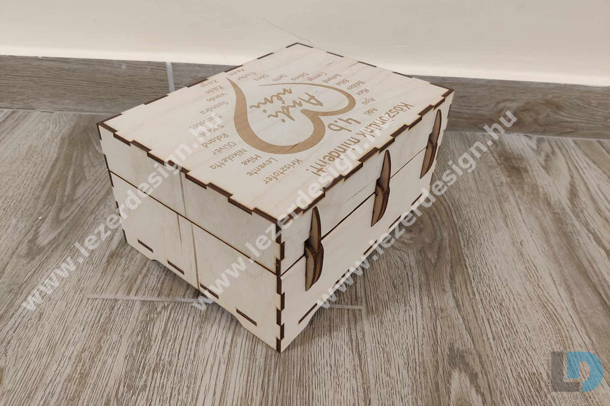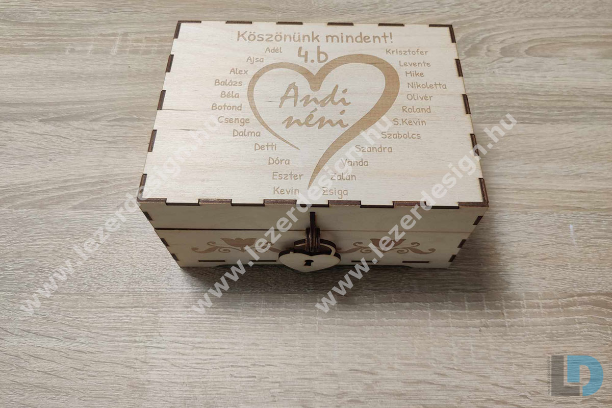 Ez a lézervágott, fából készült ajándékdoboz ideális választás személyre szabott köszönőajándéknak, például tanároknak vagy pedagógusoknak. A doboz tetején egy szív alakú gravírozás látható, amelyben egyedi név szerepel, körülötte a diákok nevével.